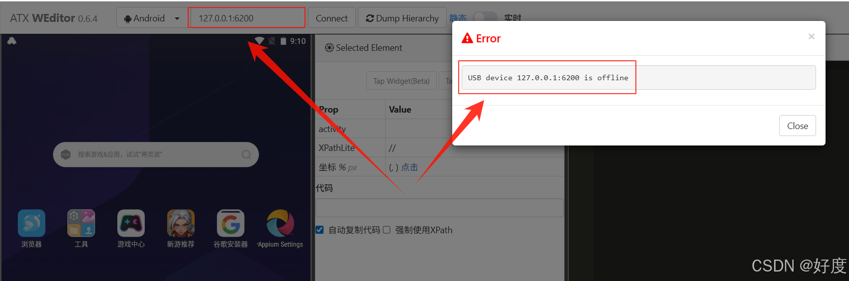 如果出现这个提示, 则说明(没有连接上模拟器)或者(WEditor中的设备和端口号填错了)