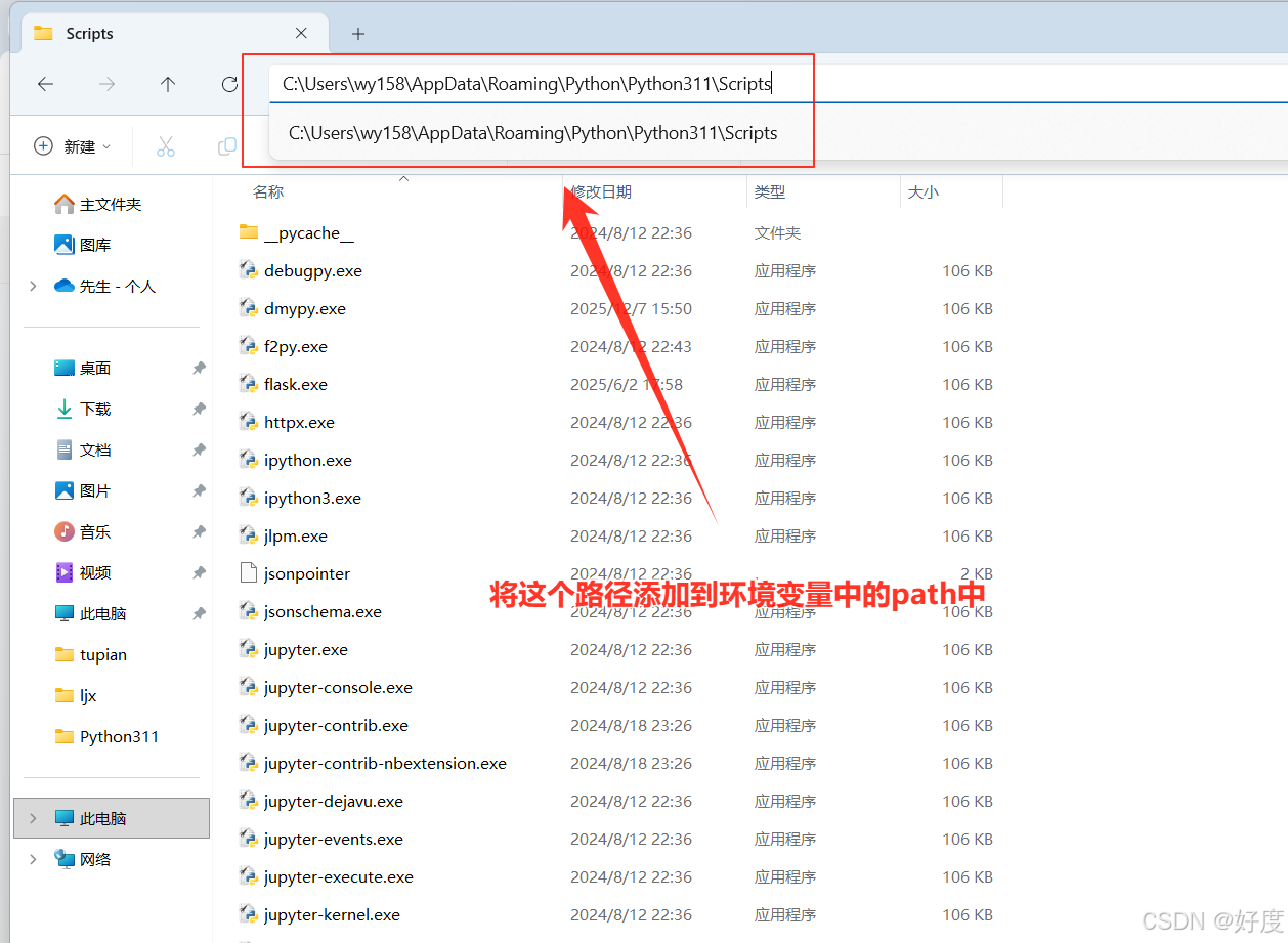 第一步:找到 Python Scripts 目录,一般都是(用户安装)