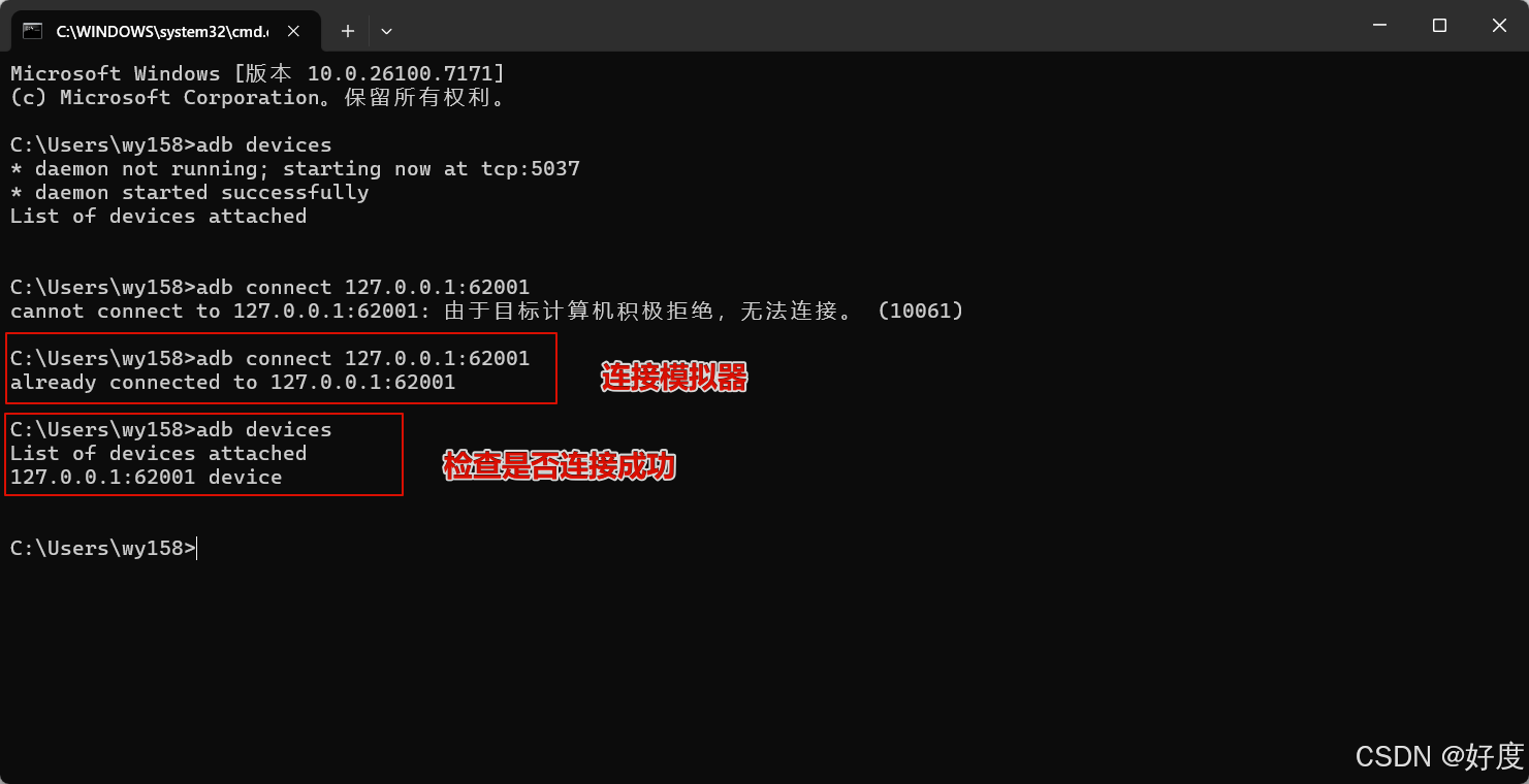 第二步:先连接上模拟器,连接命令"adb connect 127.0.0.1:62001", 使用"adb devices"检查是否连接成功