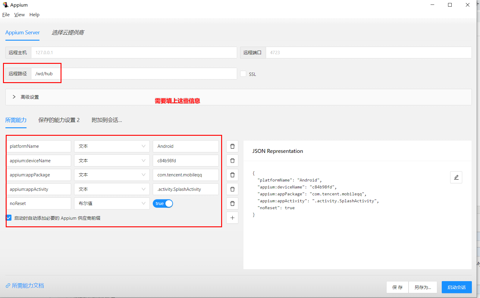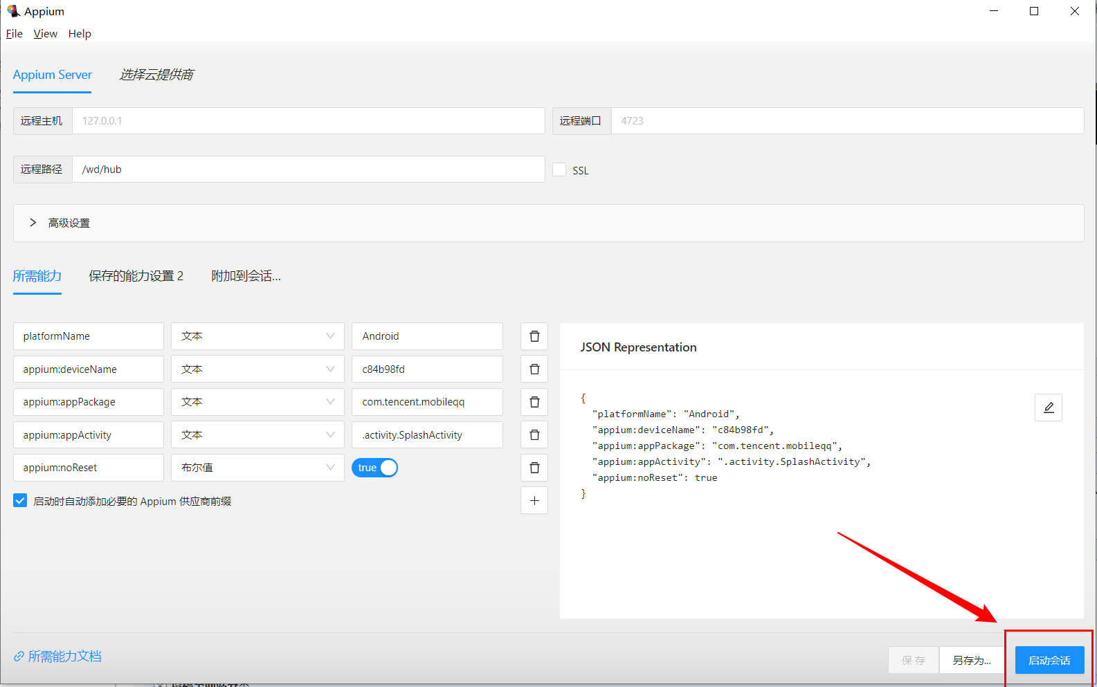 安装下图来配置Appium Inspector参数。