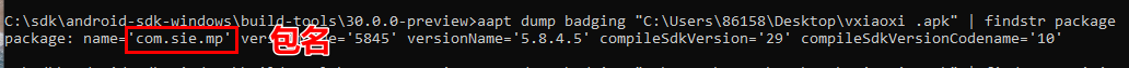 然后输入命令:aapt dump badging app包的路径 | findstr package