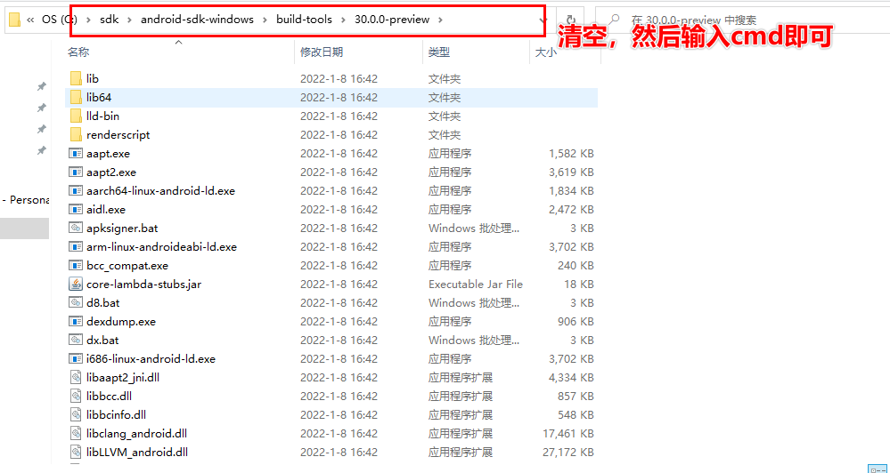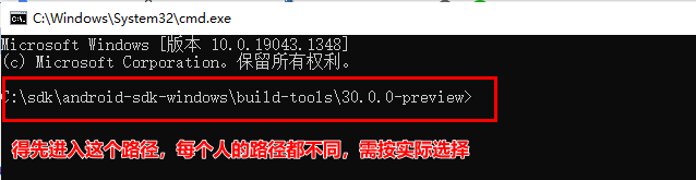 打开CMD,进入SDK的 C:\sdk\android-sdk-windows\build-tools\30.0.0-preview 路径,如下图