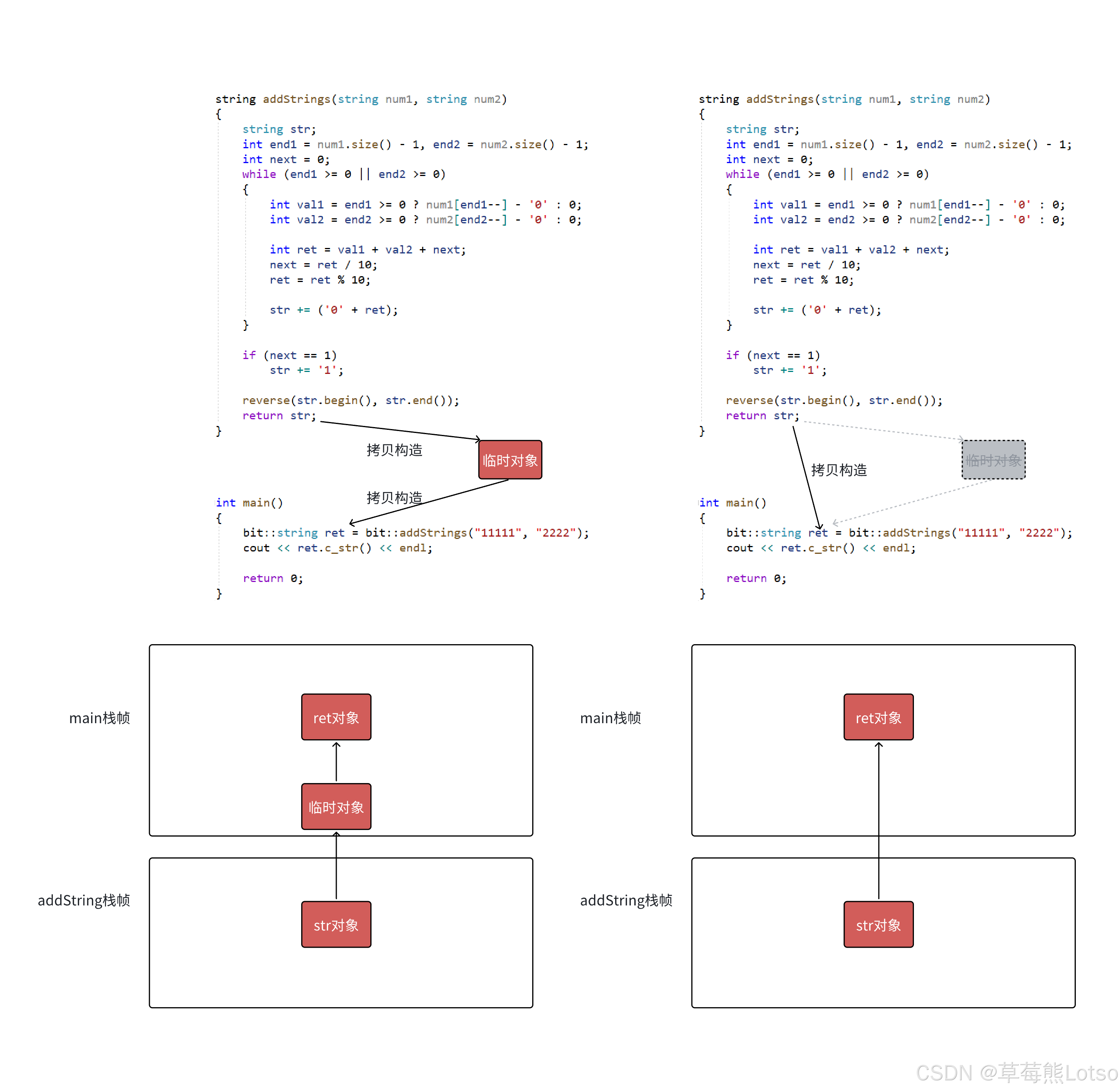下编译器的处理,⼀次移动构造,⼀次移动赋值。 - 需要注意的是在vs2019的release和vs2022的debug和release,下⾯代码会进⼀步优化,直接构造要返回的临时对象,str本质是临时对象的引⽤,底层⻆度⽤指针实现。运⾏结果的⻆度,我们可以看到str的析构是在赋值以后,说明str就是临时对象的别名。