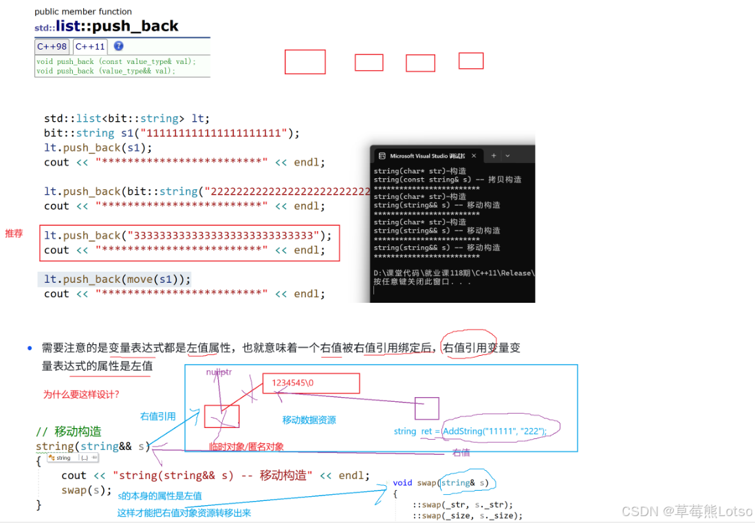 - 当实参是⼀个右值,容器内部则调⽤移动构造,右值对象的资源到容器空间的对象上