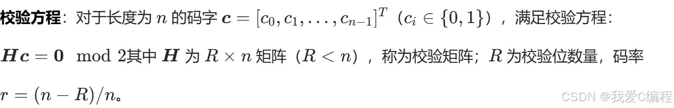 LDPC码是一类线性分组码,其编码和译码过程基于校验矩阵H和生成矩阵G实现。