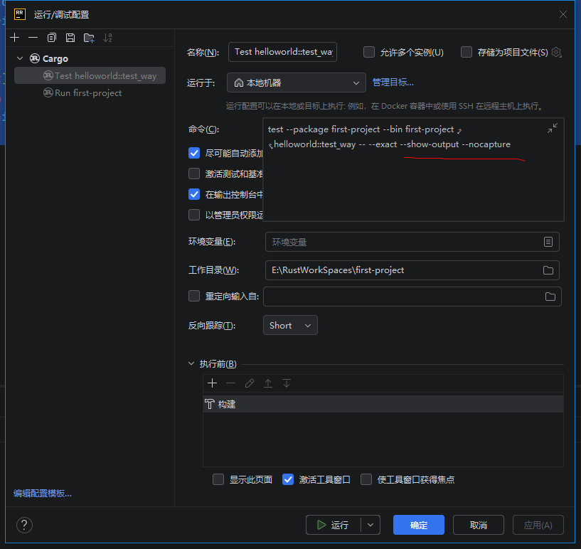 test --package first-project --bin first-project helloworld::test_way -- --exact --show-output --nocapture; - 勾选「Allow input to the application」和「Run in terminal」;