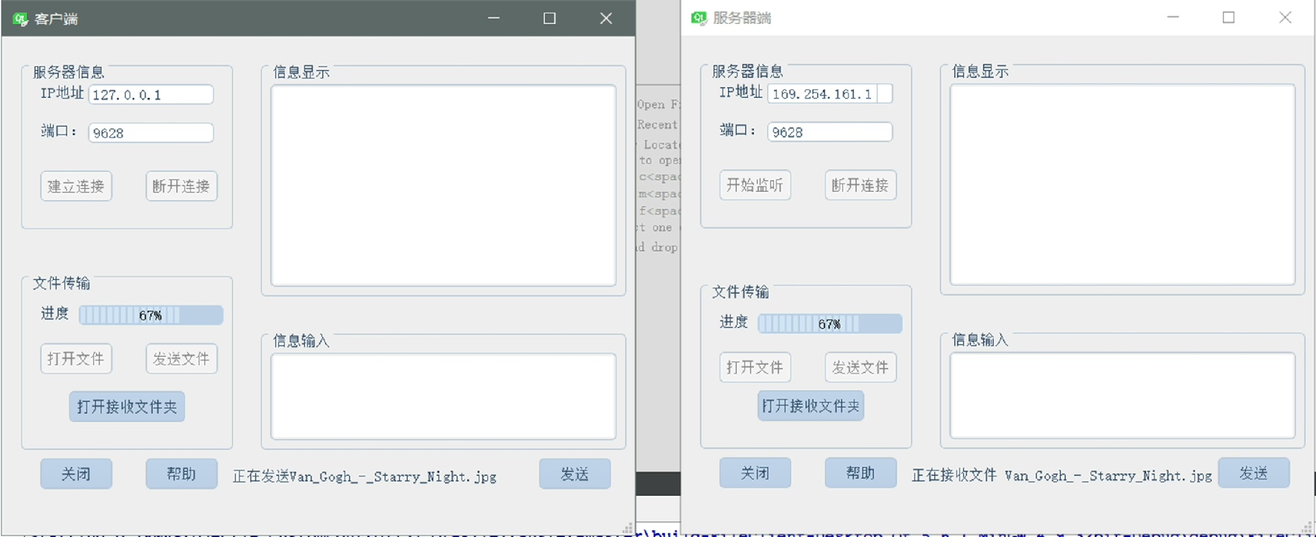 这里获取新连接的 socket,打开要传输的文件,然后和客户端往服务端传输文件类似,循环读取文件内容并写入到 socket 中,实时输出传输进度。传输完成后关闭文件和 socket。