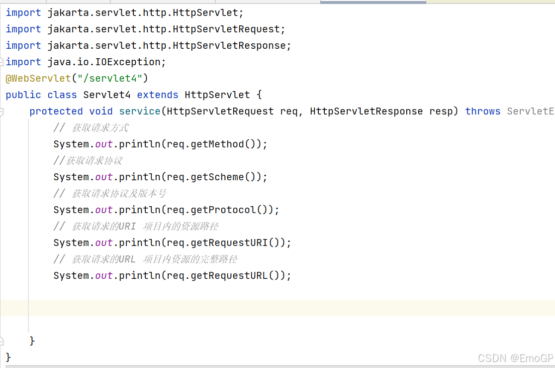 - HttpServletRequest是Tomcat将请求报文转换封装而来的对象,在Tomcat调用service方法时传入