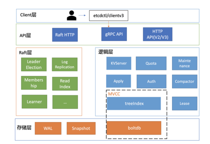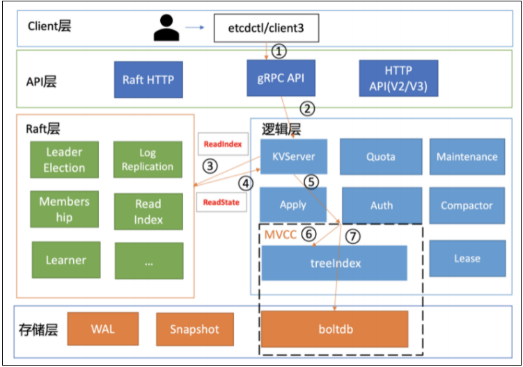 求,经过etcd server的 KVServer模块、线性读模块、MVCC的treelndex和 boltdb模块紧