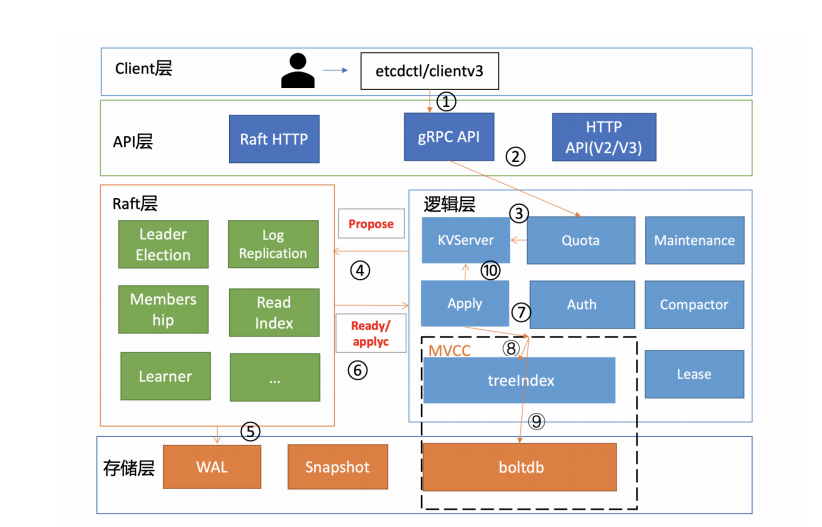 Client :凡是连接etcd 服务器请求服务的,譬如,获取key-value、写数据或 watch更新的程序,都统称为Client。Proposal :一个需要经过Raft一致性协议的请求,例如,写请求或配置更新请 求。