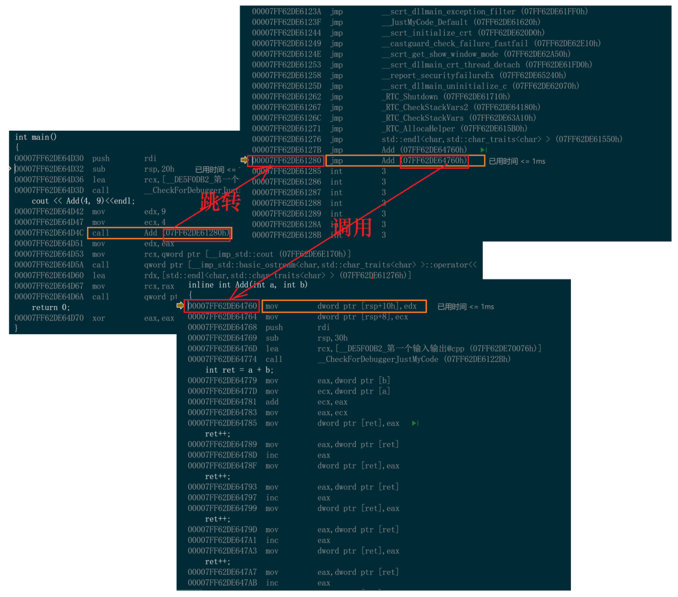 - 跳转到jmp指令 ,jmp指令 又跳转到函数的第一条指令,调用完成。