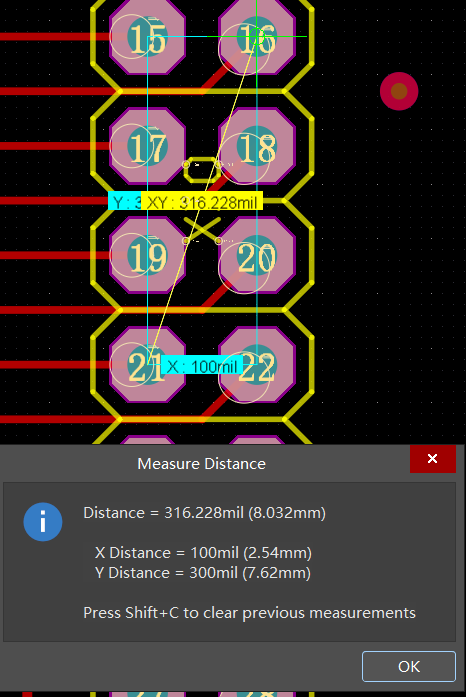 弹出一个测量结果,同时在PCB上会画出一个直角三角形,告诉你直角边和斜边的长度。