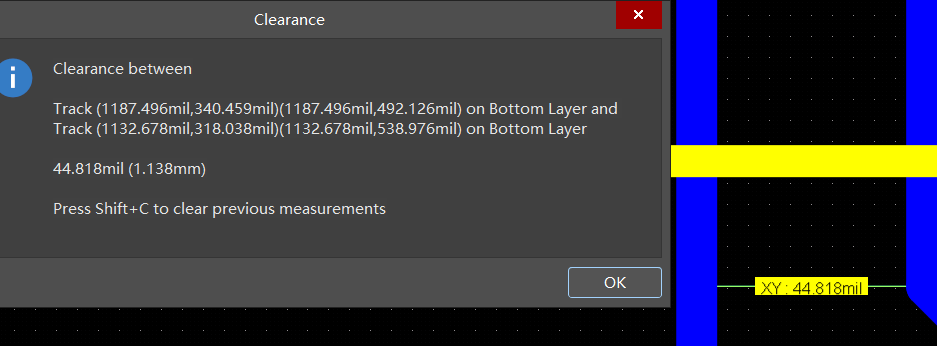 弹出的页面会告诉你两条走线的间距。需要注意的是,即使我标的两点并不是线间距,他也会为你报告间距。