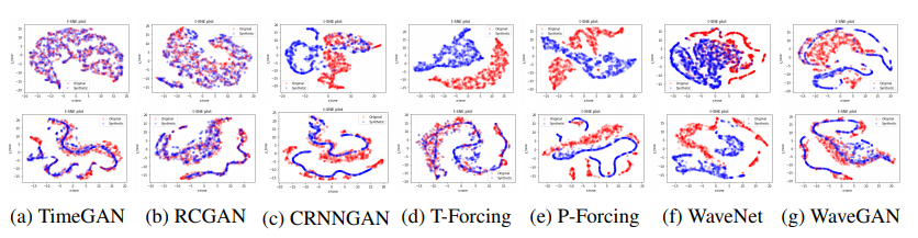 Visualizations with t-SNE and PCA. In Figure 3, we observe that synthetic datasets generated by TimeGAN show markedly better overlap with the original data than other benchmarks using t-SNE for visualization (PCA analysis can be found in the Supplementary Materials). In fact, we (in the first column) that the blue (generated) samples and red (original) samples are almost perfectly in sync.