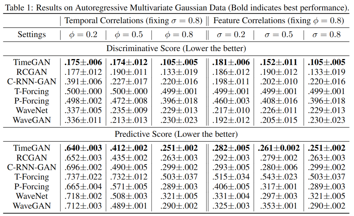 As shown in Table 1, TimeGAN consistently generates higher-quality synthetic data than benchmarks, in terms of both discriminative and predictive scores. This is true across the various settings for the underlying data-generating model. Importantly, observe that the advantage of TimeGAN is greater for higher settings of temporal correlation ϕ\phiϕ, lending credence to the motivation and benefit of the supervised loss mechanism. Likewise, observe that the advantage of TimeGAN is also greater for higher settings of feature correlation σ\sigmaσ, providing confirmation for the benefit of the embedding network.