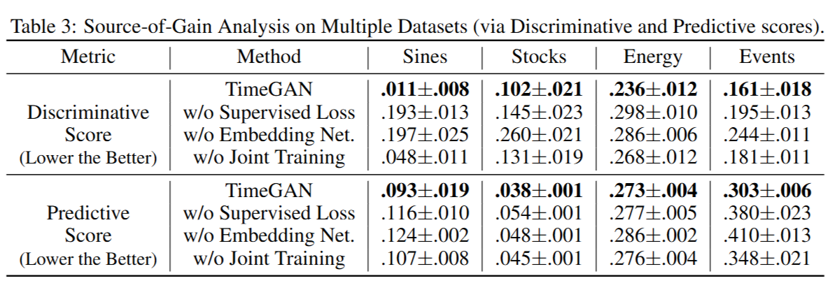 TimeGAN is characterized by (1) the supervised loss, (2) embedding networks, and (3) the joint training scheme. To analyze the importance of each contribution, we report the discriminative and predictive scores with the following modifications to TimeGAN: (1) without the supervised loss, (2) without the embedding networks, and (3) without jointly training the embedding and adversarial networks on the supervised loss. (The first corresponds to λ=η=0\lambda = \eta = 0λ=η=0, and the third to λ=0\lambda = 0λ=0).