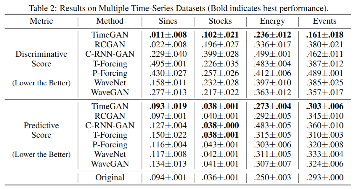 我们发现 TimeGAN 在生成逼真时间序列方面取得了一致且显著优于最先进基准的改进。