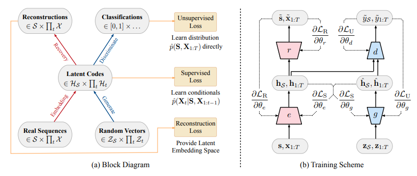 Optimization. Figure 1(b) illustrates the mechanics of our approach at training. Let θe,θr,θg,θd\theta_e, \theta_r, \theta_g, \theta_dθe,θr,θg,θd respectively denote the parameters of the embedding, recovery, generator, and discriminator networks. The first two components are trained on both the reconstruction and supervised losses,
