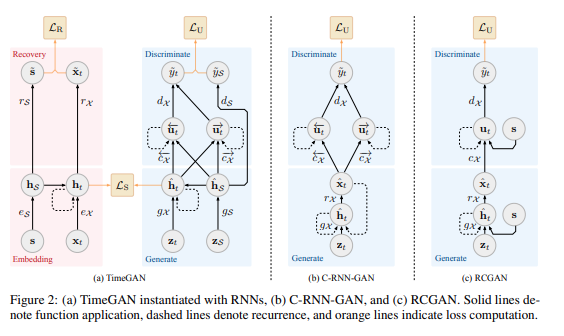 LR=Es,x1:T∼p[∣∣s−s~∣∣2+∑t∣∣xt−x~t∣∣2](7) \mathcal{L}R = \mathbb{E}{\mathbf{s}, \mathbf{x}_{1:T} \sim p} \left[ ||\mathbf{s} - \tilde{\mathbf{s}}||_2 + \sum_t ||\mathbf{x}_t - \tilde{\mathbf{x}}_t||_2 \right] \quad (7) LR=Es,x1:T∼p[∣∣s−s~∣∣2+t∑∣∣xt−x~t∣∣2](7)In TimeGAN, the generator is exposed to two types of inputs during training. First, in pure open-loop mode, the generator---which is autoregressive---receives synthetic embeddings h^S,h^1:t−1\hat{\mathbf{h}}{\mathcal{S}}, \hat{\mathbf{h}}{1:t-1}h^S,h^1:t−1 (i.e. its own previous outputs) in order to generate the next synthetic vector h^t\hat{\mathbf{h}}th^t. Gradients are then computed on the unsupervised loss . This is as one would expect---that is, to allow maximizing (for the discriminator) or minimizing (for the generator) the likelihood of providing correct classifications y~S,y~1:T\tilde{y}{\mathcal{S}}, \tilde{y}{1:T}y~S,y~1:T for both the training data hS,h1:T\mathbf{h}{\mathcal{S}}, \mathbf{h}{1:T}hS,h1:T as well as for synthetic output h^S,h^1:T\hat{\mathbf{h}}{\mathcal{S}}, \hat{\mathbf{h}}{1:T}h^S,h^1:T from the generator,