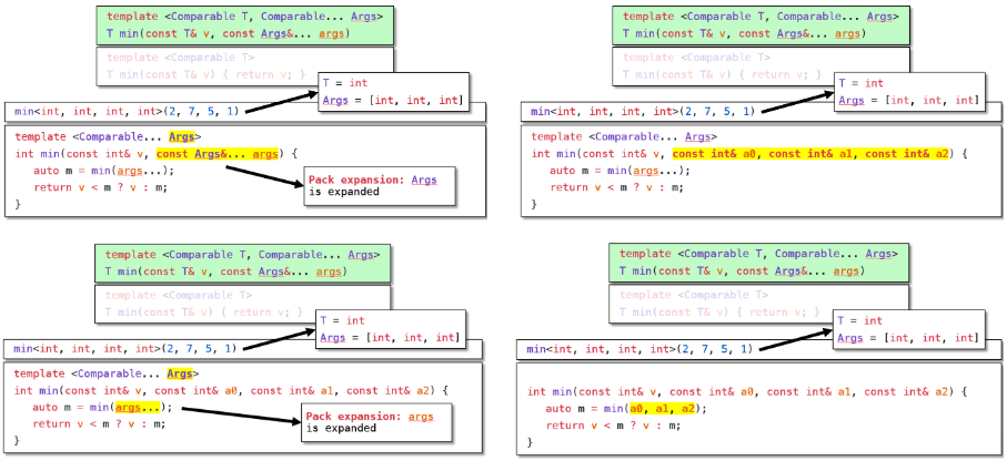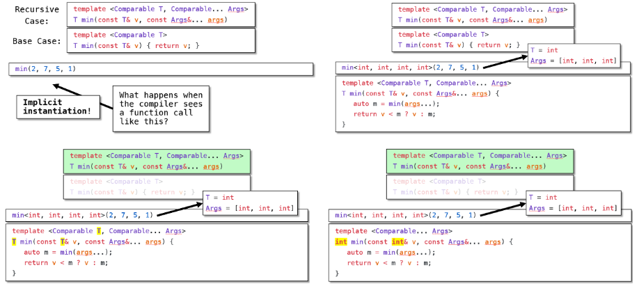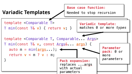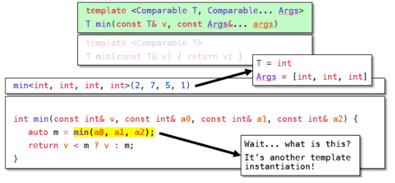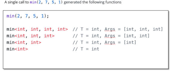 编译器使用递归生成任意数量的重载,这使我们能够支持任意数量的函数参数。