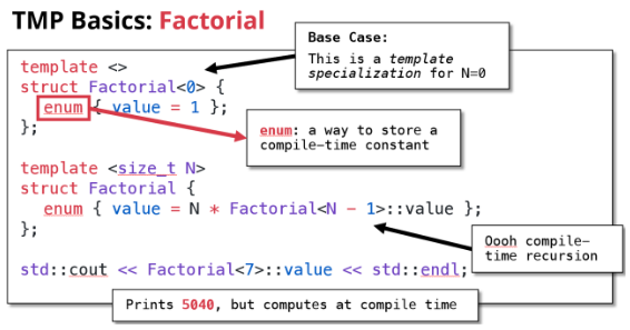 这段代码展示了使用C++模板元编程(TMP)在编译期计算阶乘的方法,核心思想是利用模板特化和递归实现编译时计算: