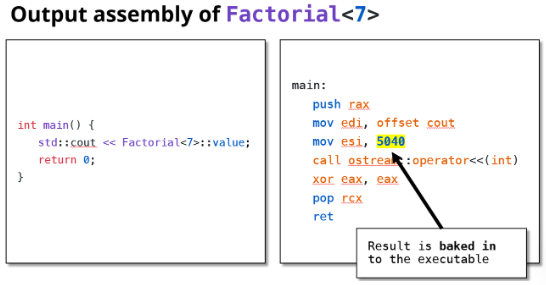 Factorial<7>::value是一个模板元编程实现,编译器在编译阶段就会计算出 7! = 5040- 汇编代码中直接出现了