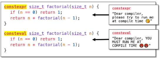 在C++20中,constexpr和consteval是用于编译期计算的关键字,它们将模板元编程的思想制度化,让编译期计算更直观: