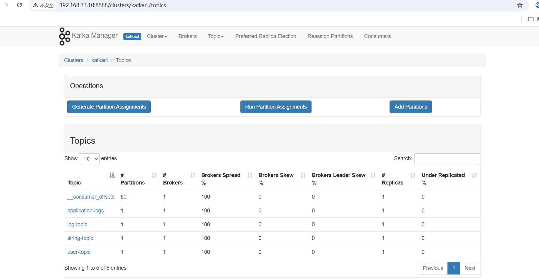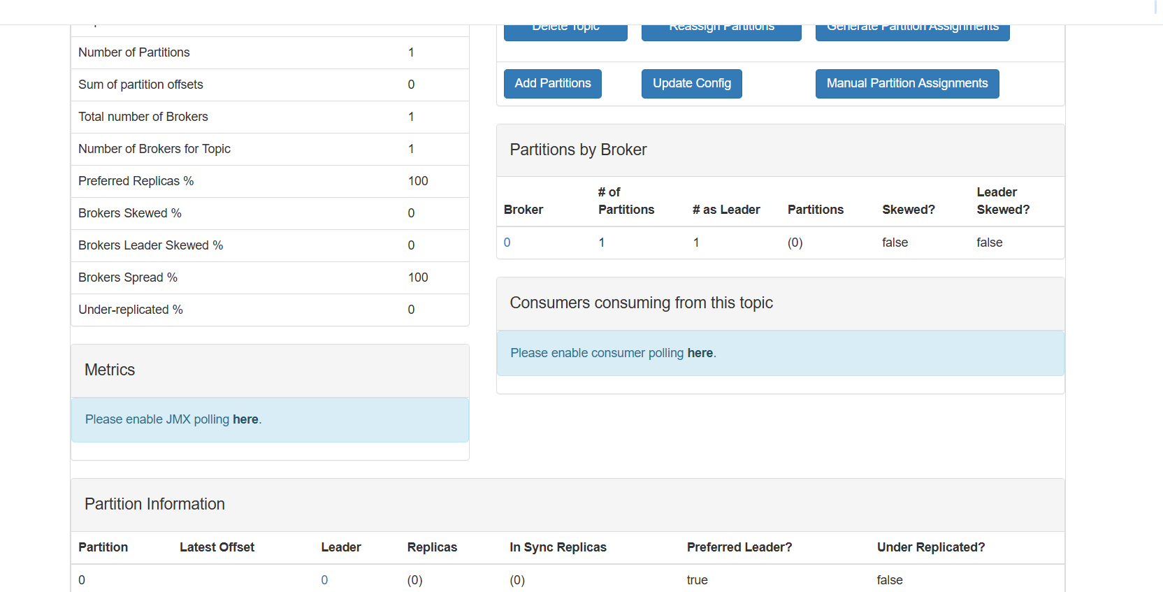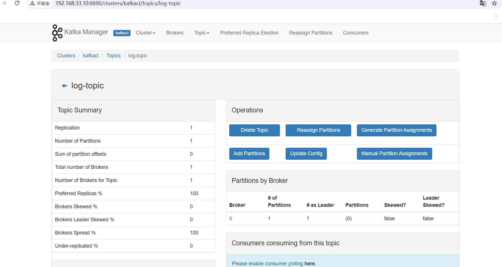 启动后打开控制面板,可以看到kafka集群节点信息和分区,消费偏移等信息: