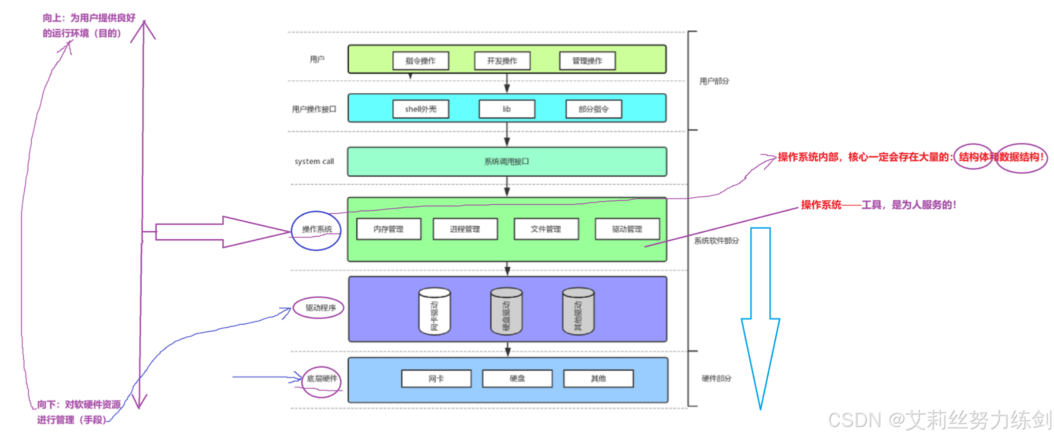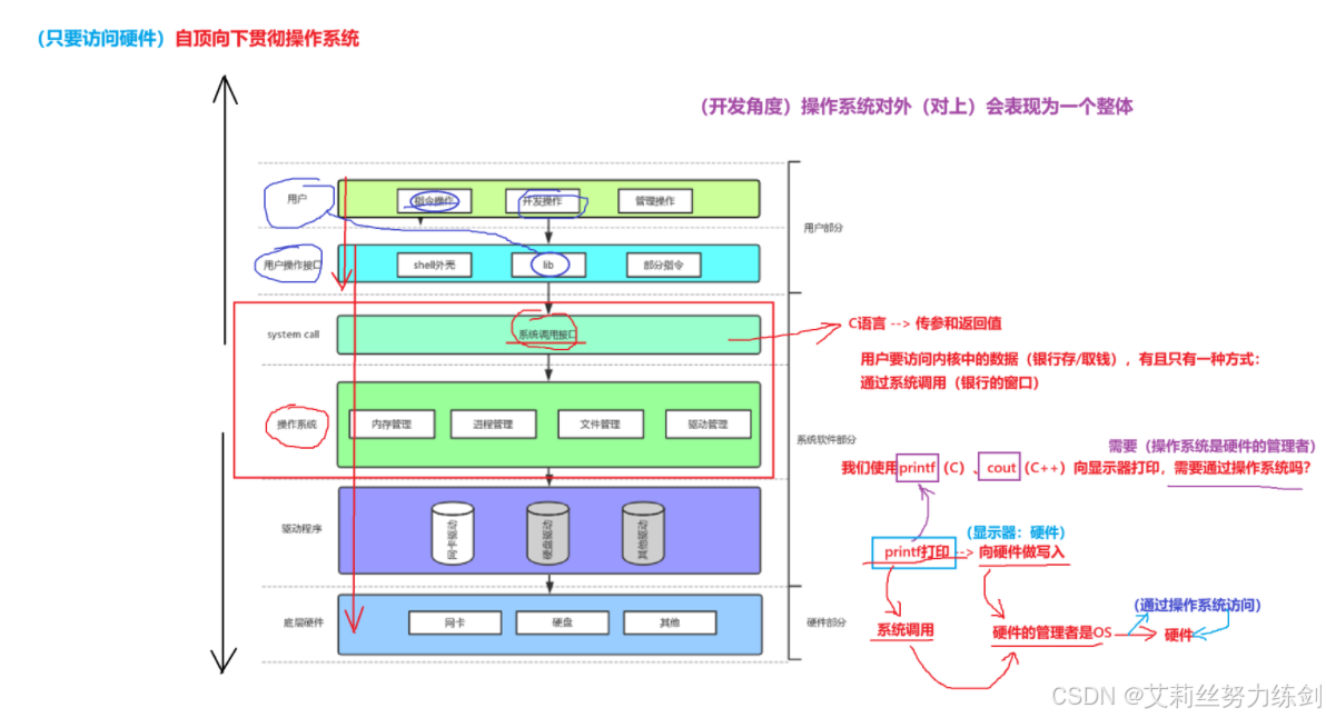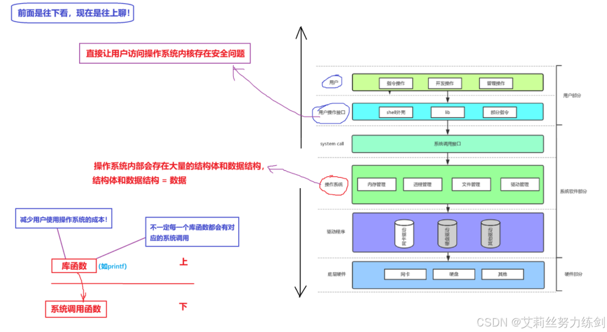 前面我们是往下看的(操作系统---驱动程序---底层硬件),现在我们往上面聊(操作系统---系统调用接口---用户操作接口---用户)。