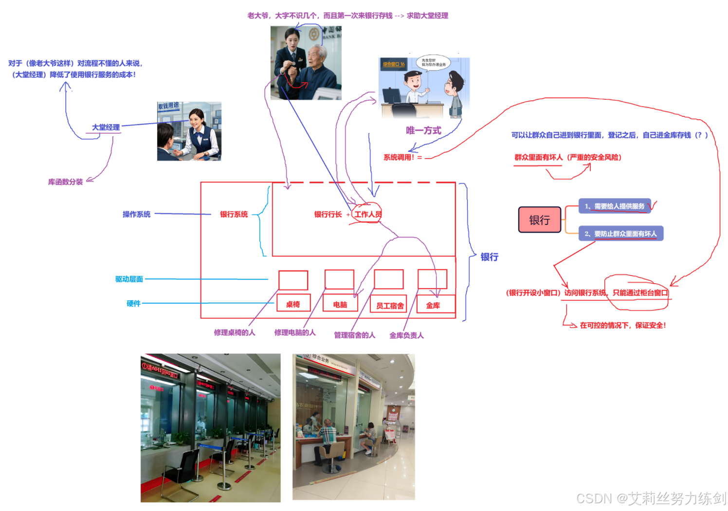 不是所有人都熟悉银行流程,所以银行有大堂经理,比如如果是一位大字不识一个的老大爷呢?老大爷别说电脑了,连字都不会写。是不是就需要有一个大堂经理领着老大爷过一遍流程?这个大堂经理或者说工作人员就是所谓的库函数,有对应的系统调用,目的就是为了降低用户(这里是老大爷)的使用银行的成本的。