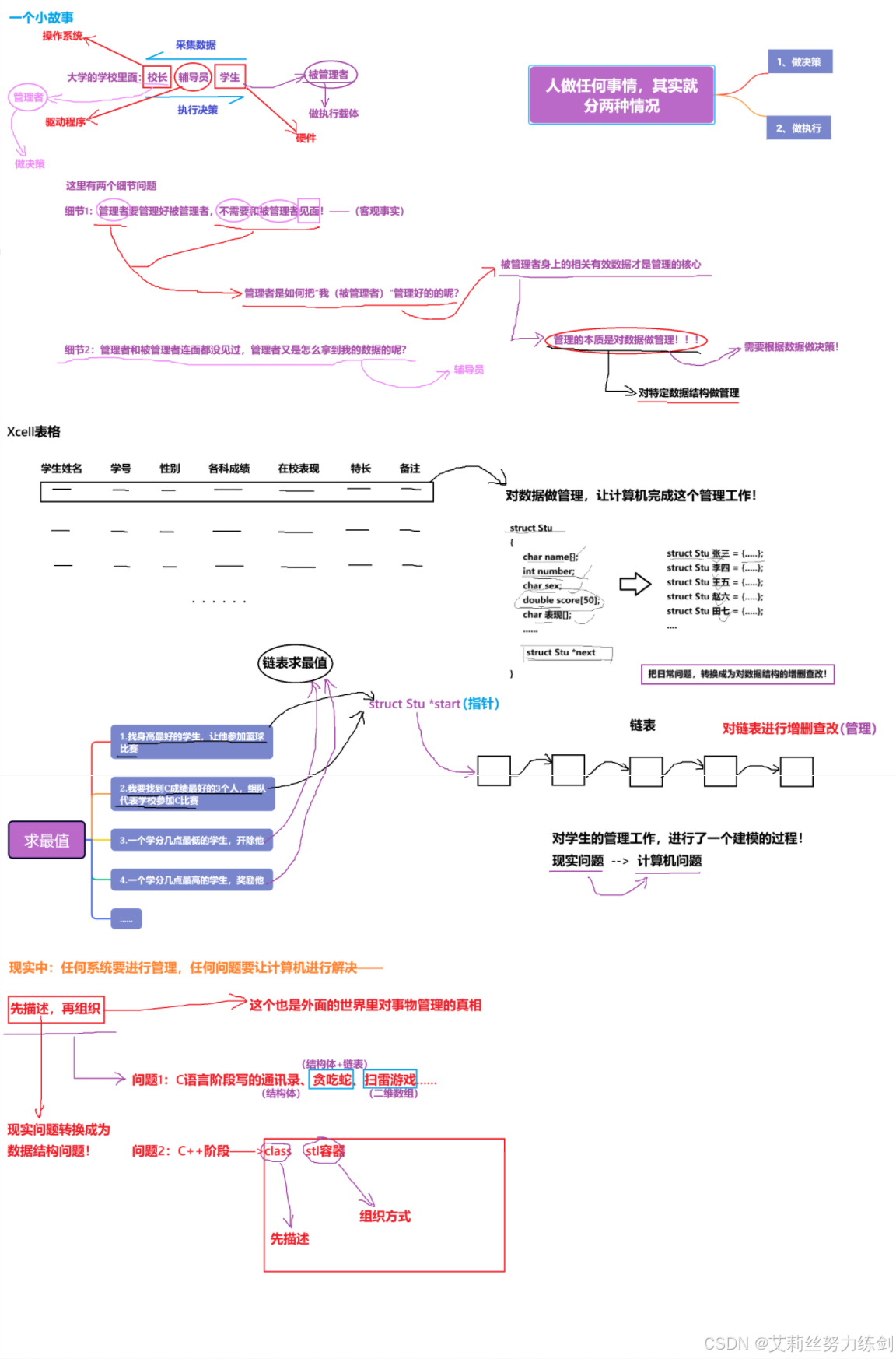 本来要用Xcell表格对数据做管理的,现在我们让计算机完成这个管理工作!如上图所示,也就是说,我们把日常问题,转换成为对数据结构的增删查改!比如这里就是对链表进行增删查改(管理),即通过对数据结构进行增删查改完成对数据的管理!实际上是对学生的管理工作,进行了一个建模的过程!现实问题转换成为计算机问题。