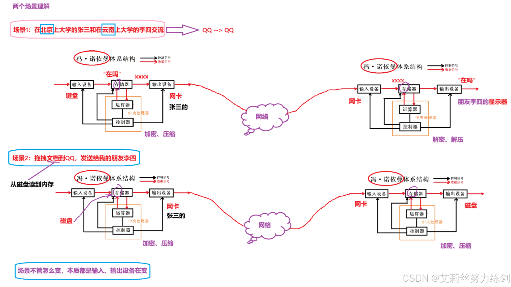 了解了冯·诺依曼体系结构之后,我们再来理解一下在日常生活中双方在基于各自电脑进行通信时的整个数据流向问题。