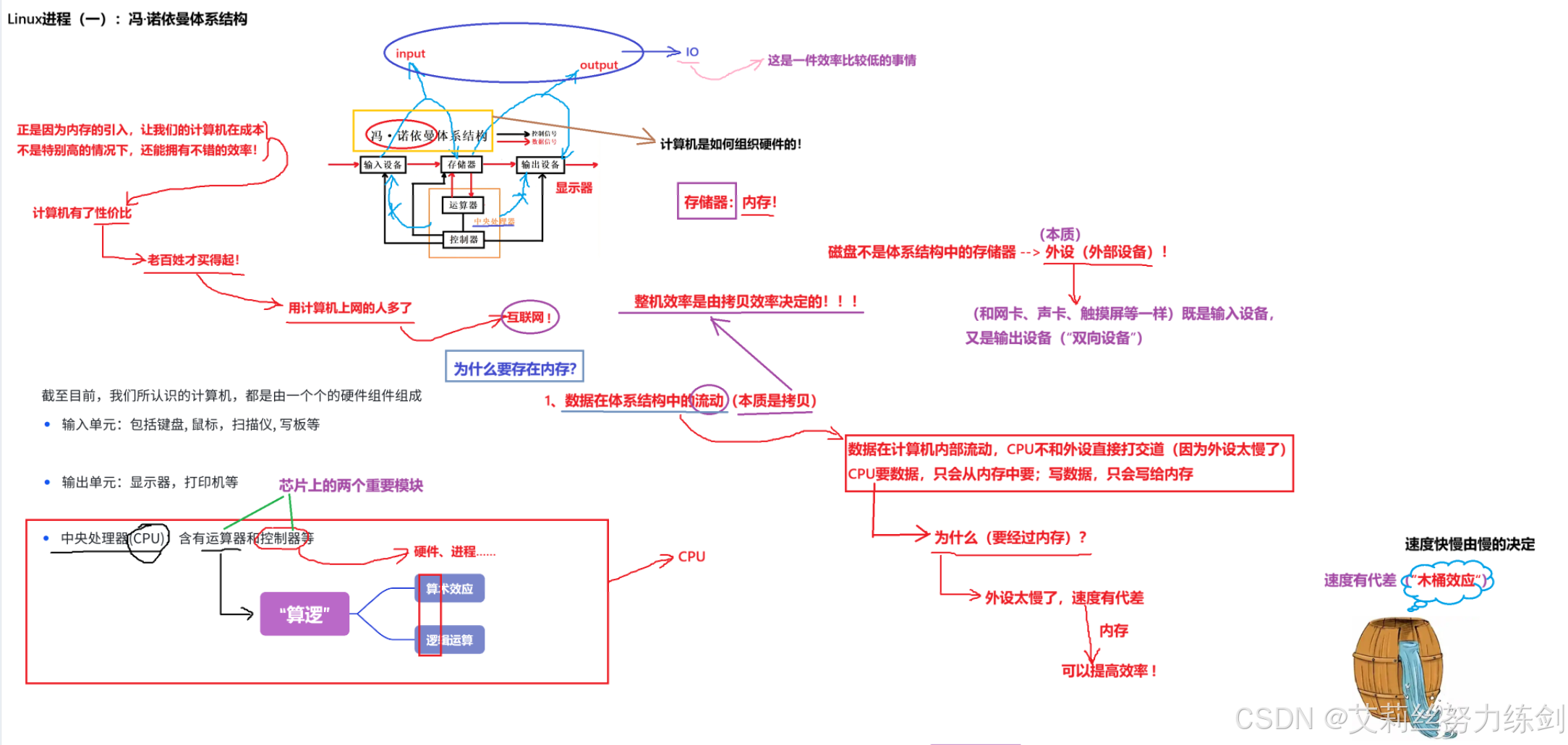 冯·诺依曼体系结构是我们计算机(尤其是英特尔架构下的计算机)的一个主要的计算机的骨骼,那么当我们把硬件以及数据在硬件下如何流动搞清楚了,后面我们谈论到诸如操作系统如何加载、可执行程序加载、动态库加载、包括从网络当中获取数据、或者从键盘里输入数据等等,整个过程我们也就能够理解了,至少有一种情况我们已经可以理解了,比如说在以前写C语言和C++时候用过的scanf / printf(获取键盘的输入),从冯·诺依曼体系结构角度,是把scanf / printf对应的可执行程序先加载到内存------键盘输入是先输入到内存------相当于到了程序内部(因为程序本来就在内存内部),即相当于把内存加载到内存内部的程序了,至此我们就获得了用户所输入的数据,这也就相对比较基础地解释了当时为什么scanf写数据的时候能够让我们看到,包括之前艾莉丝更新的进度条的博客里面写过的进度条,为什么printf打印的东西没有直接显示出来------因为printf打印的东西是放在内存当中,之前在软件层面上我们的说法叫"缓冲区",后面我们在硬件层面上就是写入到内存里面了,写入到内存里面只不过是没刷新出来因而看不到罢了。
