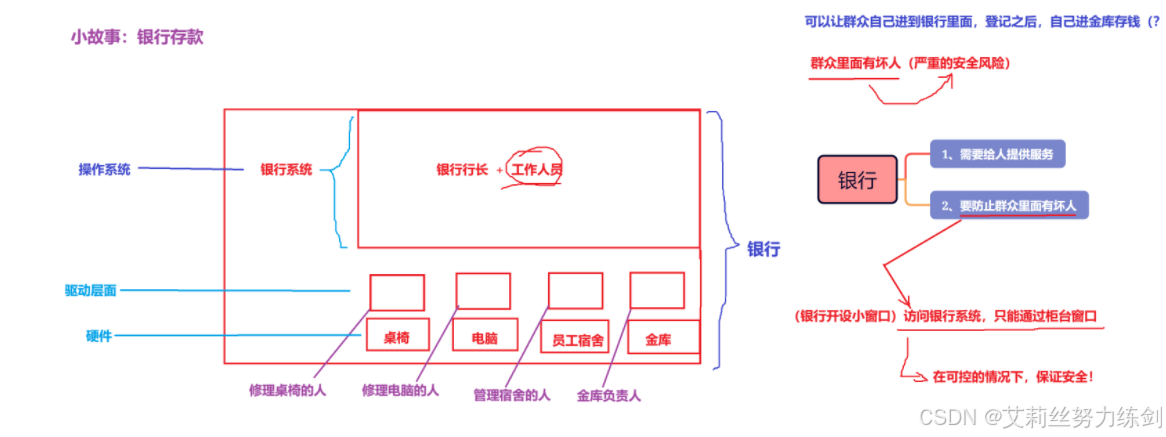 用户要访问操作系统内核中的数据(我们下面会举一个银行的例子,或者说银行有关的小故事,这个访问操作系统内核中的数据的操作就类似于访问银行系统进行存款取款操作),有且只有一种方式------就是通过系统调用(也就是我们后面所说的银行小窗口)。