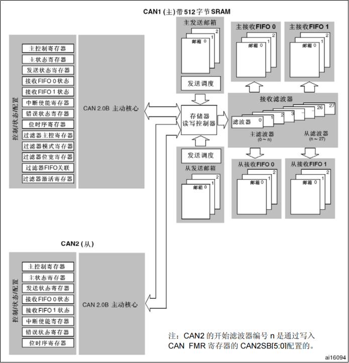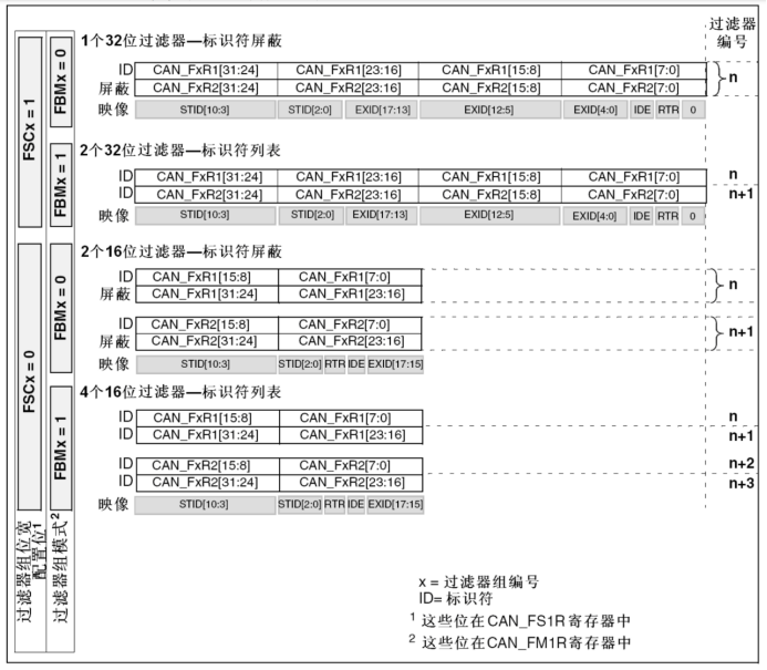 每个CAN提供了14个位宽可变的、可配置的过滤器组(13~0)。每个过滤器组x由2个32位寄存器,CAN_FxR1和 CAN_FxR2组成。