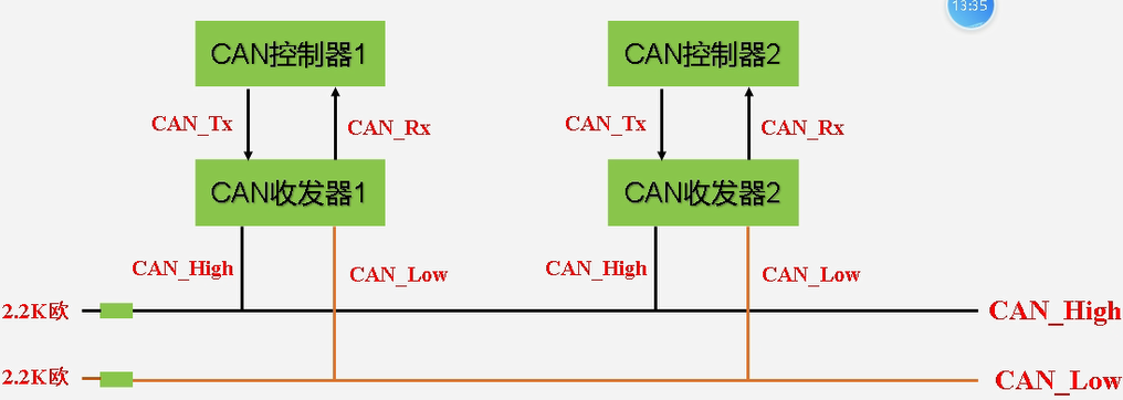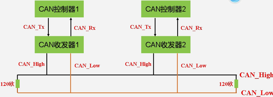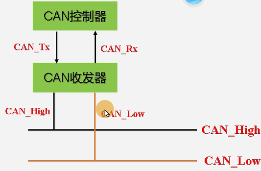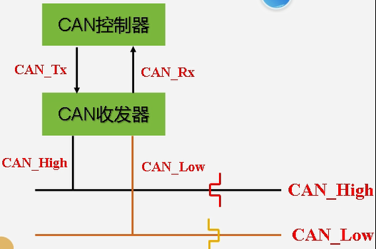 控制器和收发器之间通过CAN_Tx及CAN_Rx信号线相连,收发器与CAN总线之间使用CAN_High及CAN_Low信号线相连