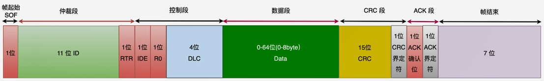 长度为11位(11bits),ID10~ID0.按照ID10~ID0的顺序进行传输。