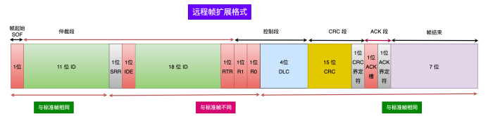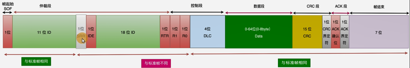 扩展帧与标准帧的不同在于仲裁段和控制段,其他完全一样。