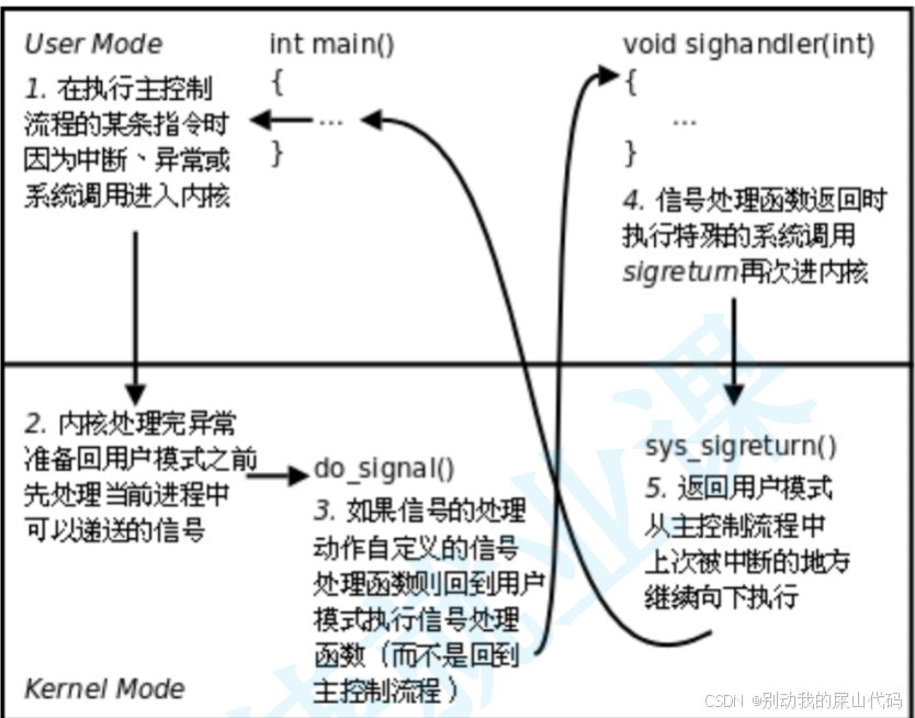 内核决定返回用户态后不是恢复 main 函数的上下文继续执行,而是执行 sighandler 函数,sighandler 和 main 函数使用不同的堆栈空间,它们之间不存在调用和被调用的关系,是两个独立的控制流程。