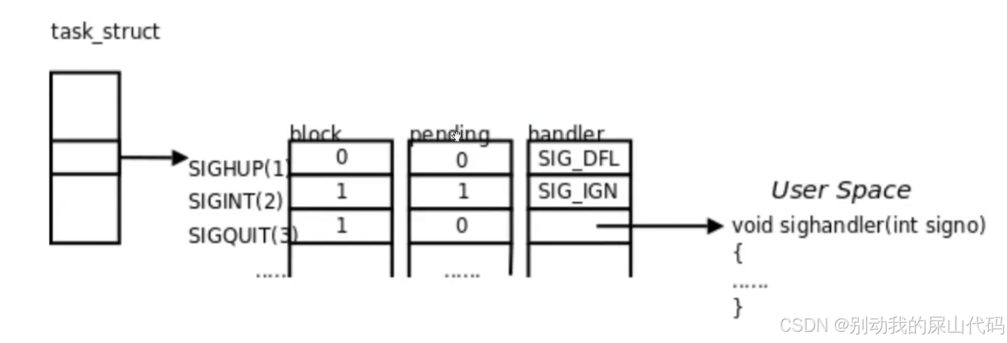 每个信号都有两个标志位分别表示阻塞(block)和未决(pending),还有一个函数指针表示处理动作(handler)。