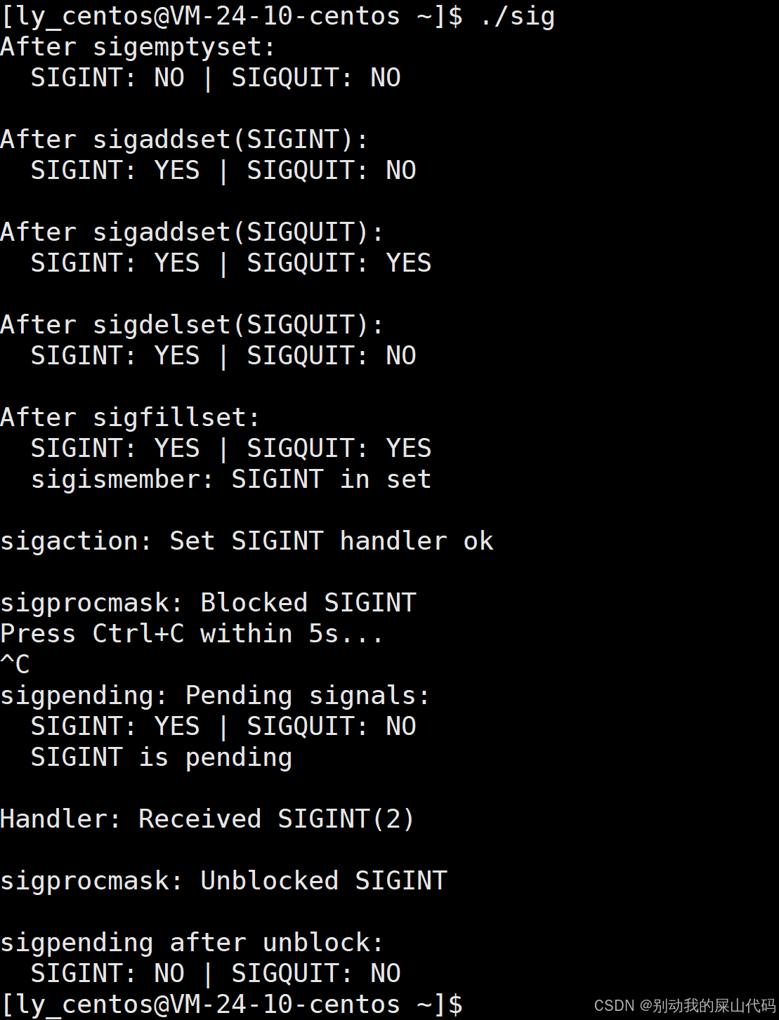 注意:SIGKILL和SIGSTOP即使被加入信号集,也无法被阻塞(系统强制规定)。