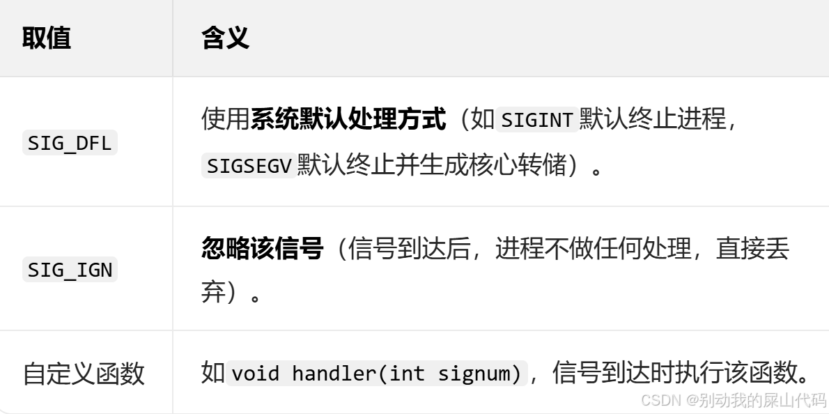 signum:要处理的信号(除SIGKILL/SIGSTOP外)。
