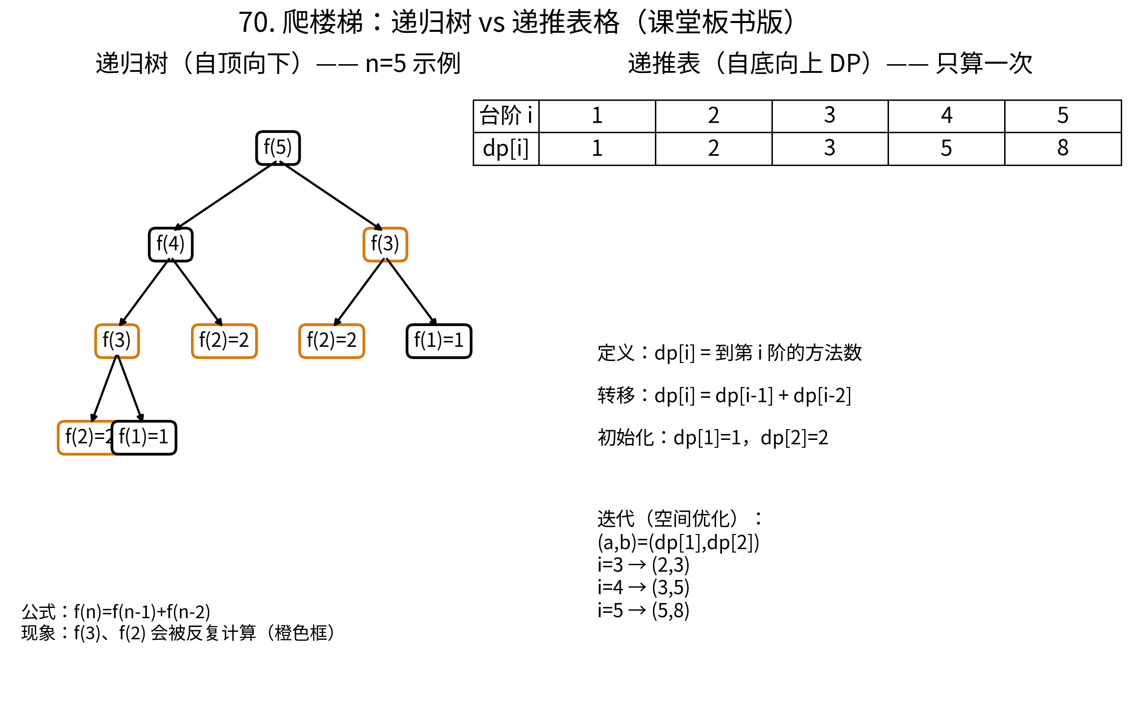 | 递推 DP 数组 | 自底向上(1→n) | ❌不重复 | O(n) | O(n) |