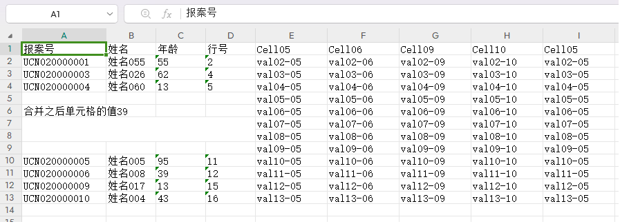 ws.cell(row=9, column=1, value=f'合并之后单元格的值{random.randint(90,200)}')