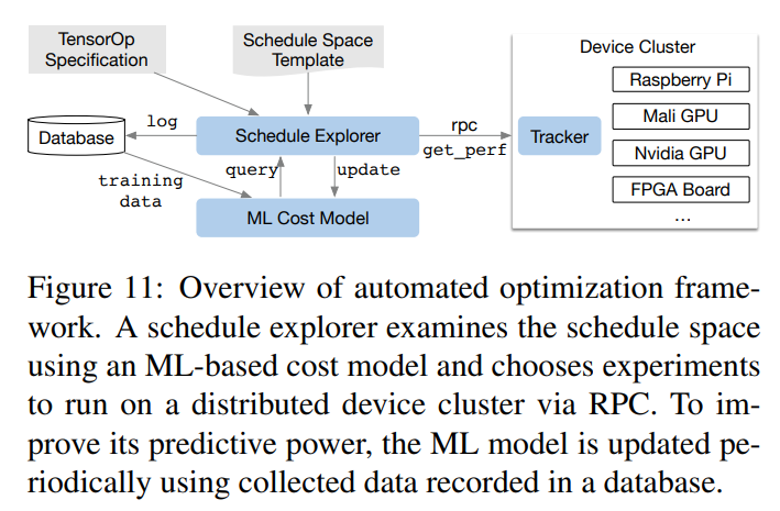 How to find the optimal parameter is very important. It proposed a ML-based cost model, which is a gradient tree boosting model based on XGboost, to predict these prameters by giving the loop pragram in the kernel, which include the memory access count, and the resue ratio of each memory buffer, as well as one-hot encoding of loop annotation such as "vectorize", "unroll" and "parallel". As shown in the following graph, the collected data can be train the model again. So the TVM matainer will updated this model periodicly.