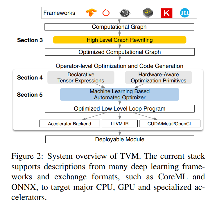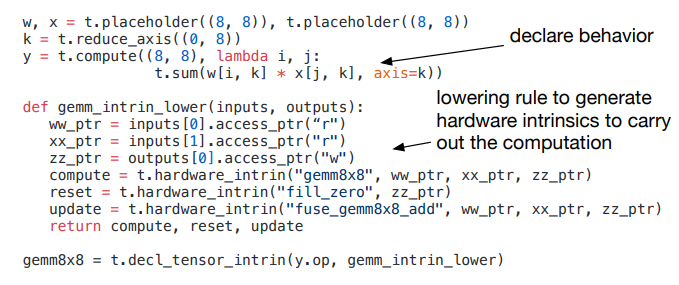 TVM seperate schedule and compute. So it can detribute different devices. There are 3 schedule primitives in TVM, Special Memory Scope, Tensorizaiton, Latency Hiding.