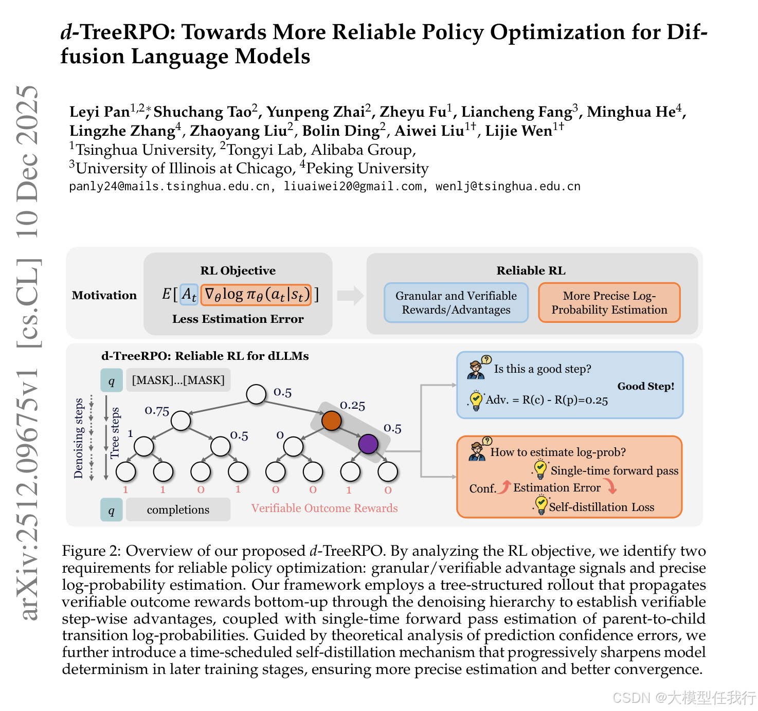 用于扩散大型语言模型 (dLLM) 的可靠强化学习 (RL) 需要准确优势估计和预测概率的精确估计。现有的 dLLM 的 RL 方法在两个方面都很短:它们依赖于粗略或不可验证的奖励信号,并且它们在不考虑相对于正确集成所有可能的解码顺序的真实无偏预期预测概率的偏差的情况下估计预测概率。为了缓解这些问题,我们提出了 d-TreeRPO,这是一种可靠的 dLLM RL 框架,它利用基于可验证结果奖励的树结构推出和自下而上的优势计算来提供细粒度和可验证的逐步奖励信号。在从父节点估计条件转移概率到子节点时,我们从理论上分析了无偏期望预测概率与通过单次前向传递获得的估计之间的估计误差,发现较高的预测置信度会导致较低的估计误差。在该分析的指导下,我们在训练期间引入了一个时间调度的自蒸馏损失,以增强后期训练阶段的预测置信度,从而实现更准确的概率估计和改进的收敛性。实验表明,d-TreeRPO 优于现有的基线,并在多个推理基准上获得了显着的收益,包括 Sudoku 上的 +86.2、Countdown 上的 +51.6、GSM8K 上的 +4.5 和 Math500 上的 +5.3。消融研究和计算成本分析进一步证明了我们设计选择的有效性和实用性。