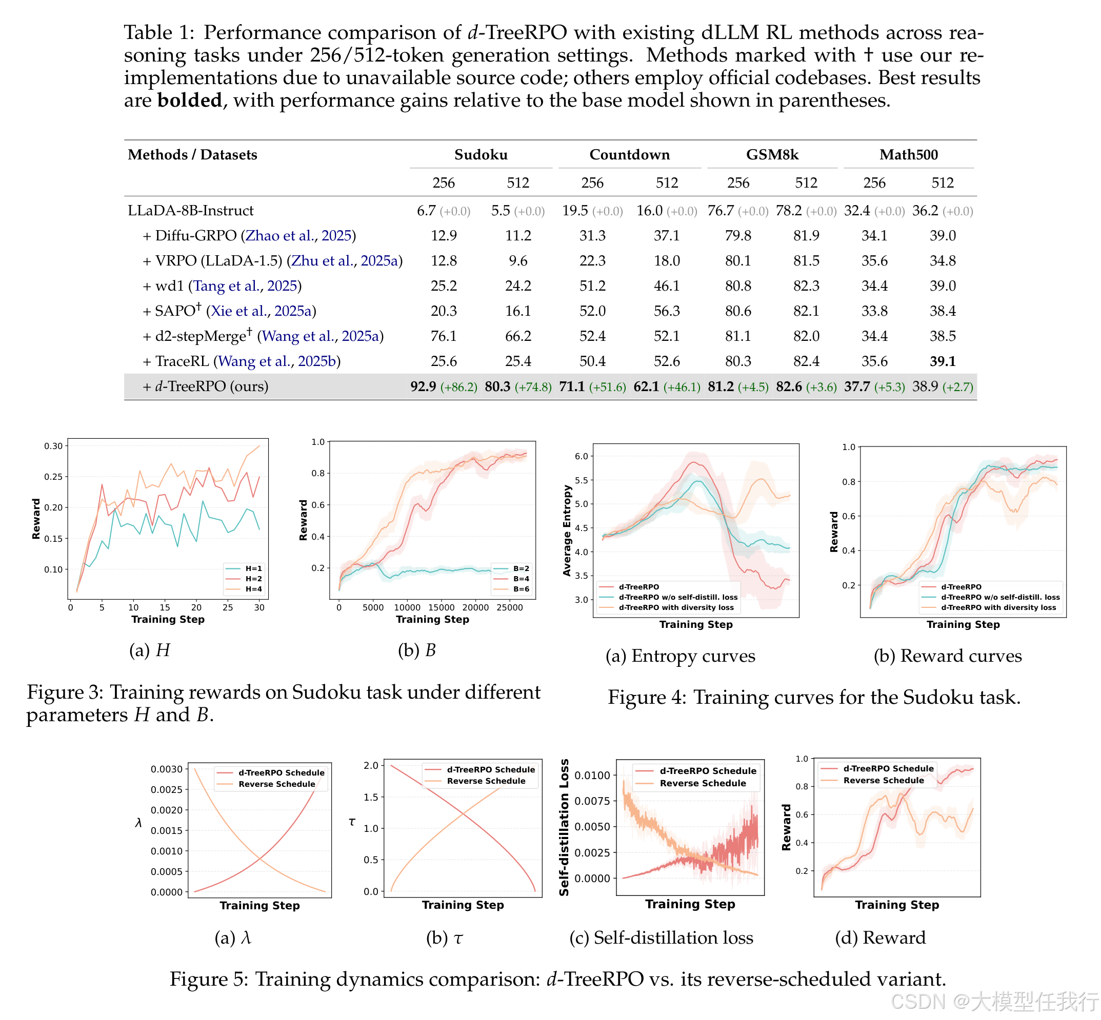 🔸d-TreeRPO在多个推理基准上显著优于现有的dLLM RL方法,具体包括在数独等任务上提高了多达86.2%。