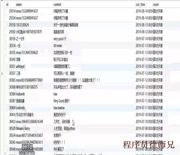 数据是一切来源的基础,我相信我们做数据分析的每一位朋友都听到过这样的话语吧。没错,做为慕课网课程情感分类的研究来说,首先就是要取到慕课网的原始数据,那么在些我主要是采用了爬虫的技术进行获取,在保证人家慕课网正常使用的情况下,用最少的压力进行的数据获取。那么主要数据是保存的一些开课的时间、用户名和关键的对些评价信息,如下图所示: