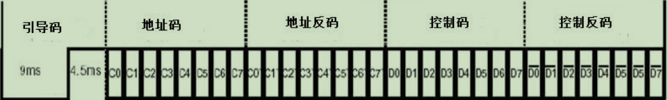 NEC 遥控指令的数据格式:引导码、地址码、地址反码、控制码、控制反码。